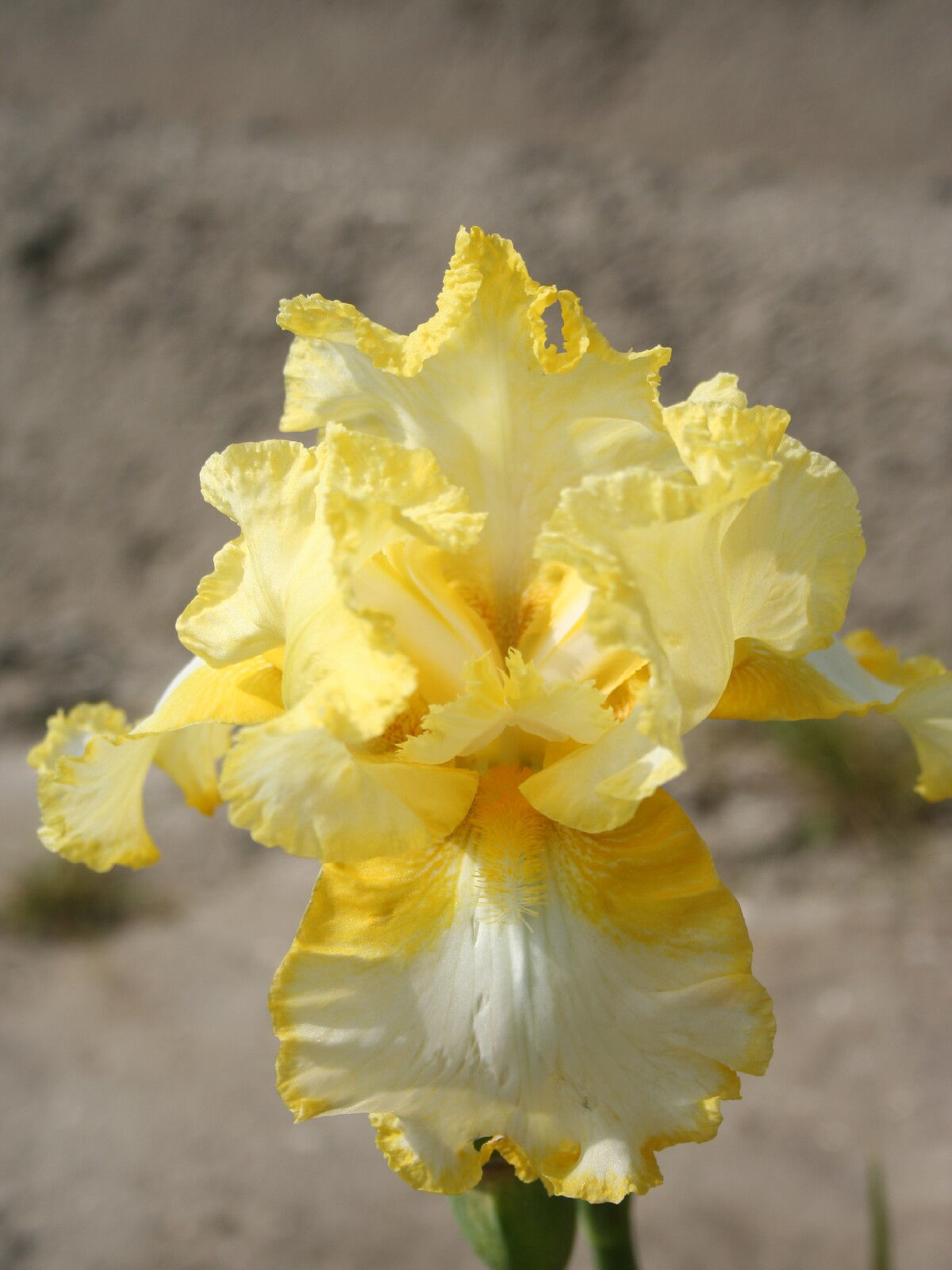 Zachtgeel met witte ondergrond, gele geruffelde rand, geurend.
