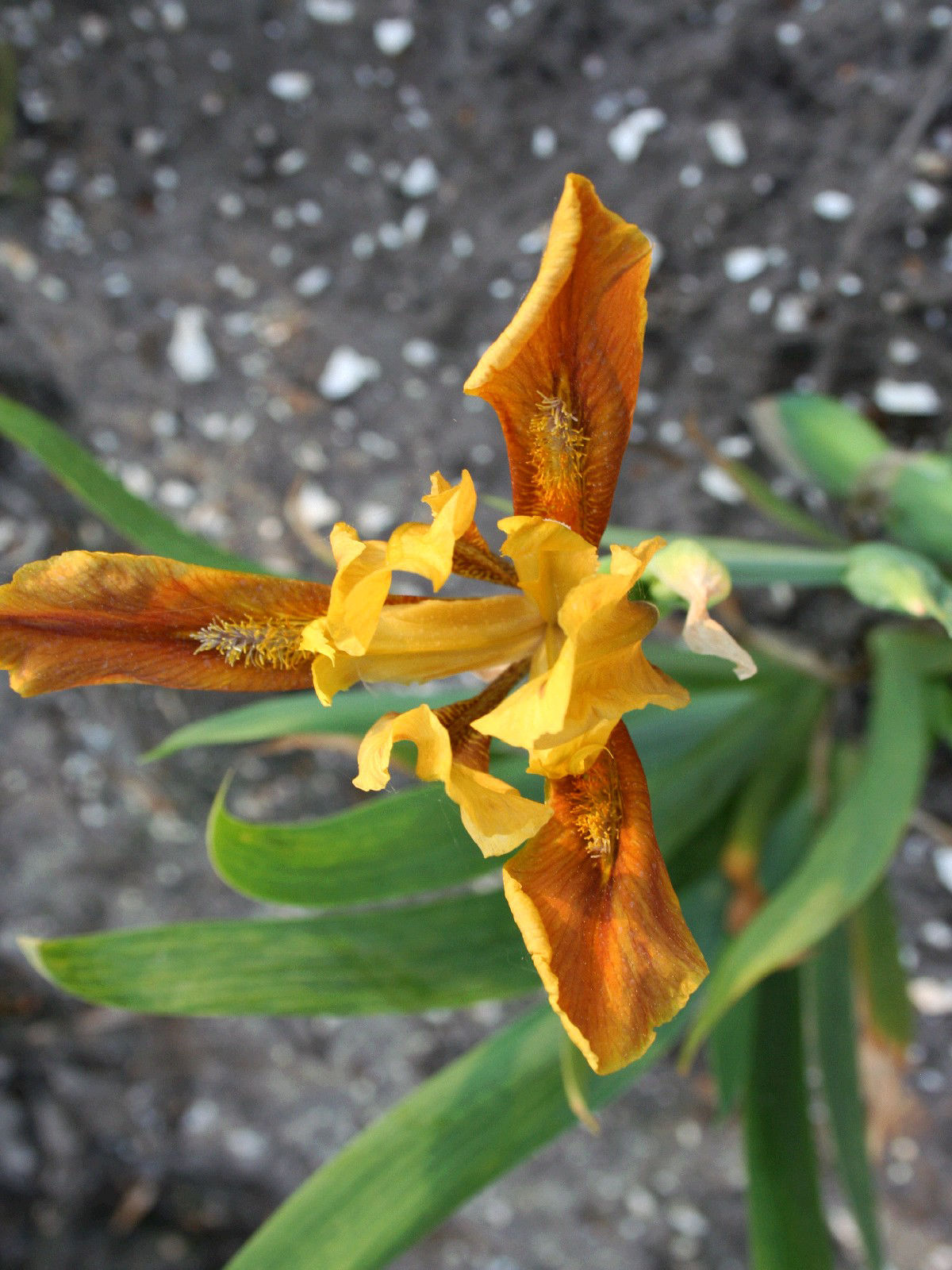 De eerste spider iris een rare kleine iris bruin geel , bijzonder maar met een a twee bloemen weining verkrijgbaar.