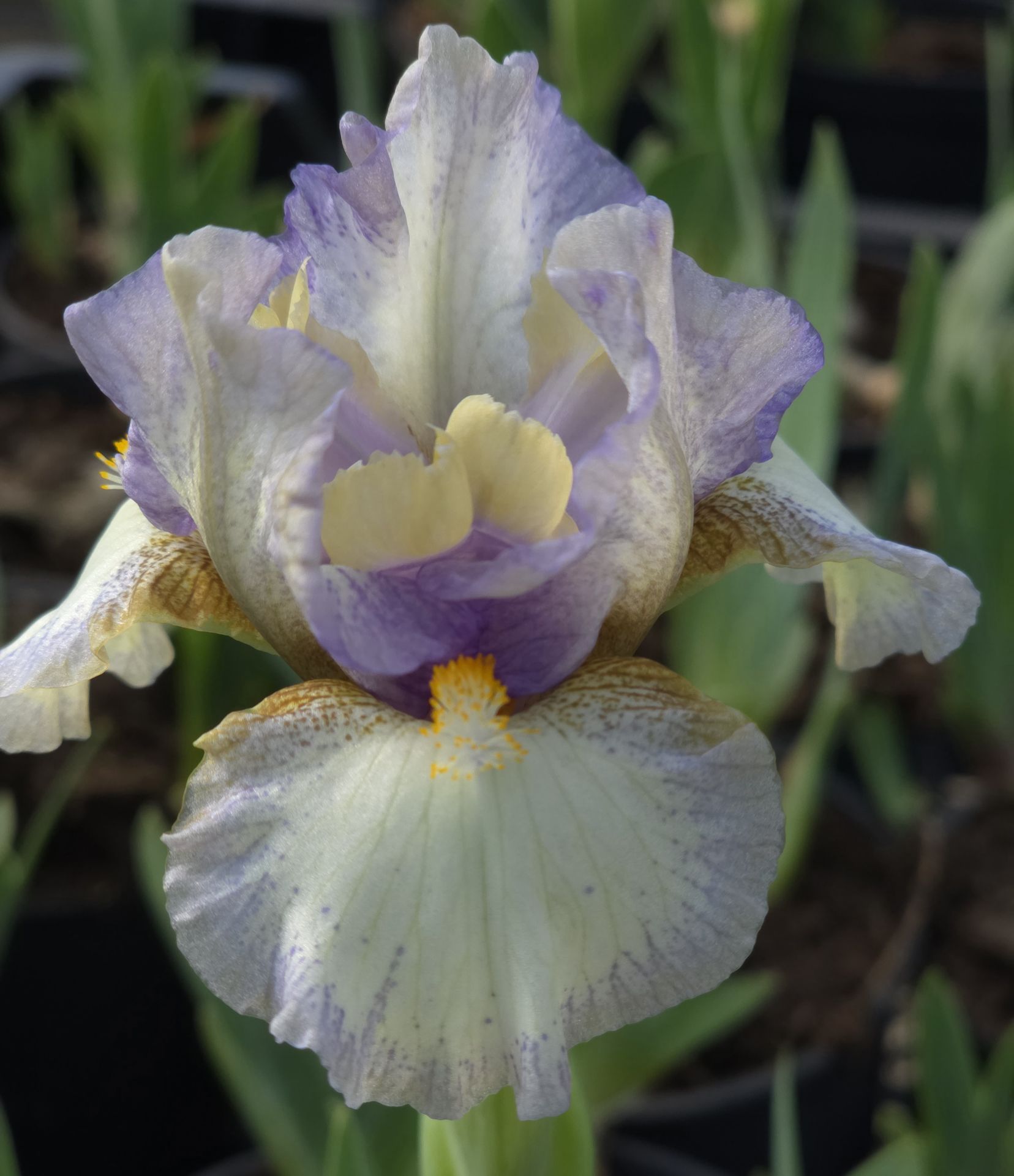 Witte onderrond met lichtblauwe randen en sproeten, geel oranje baard met witbl tip.