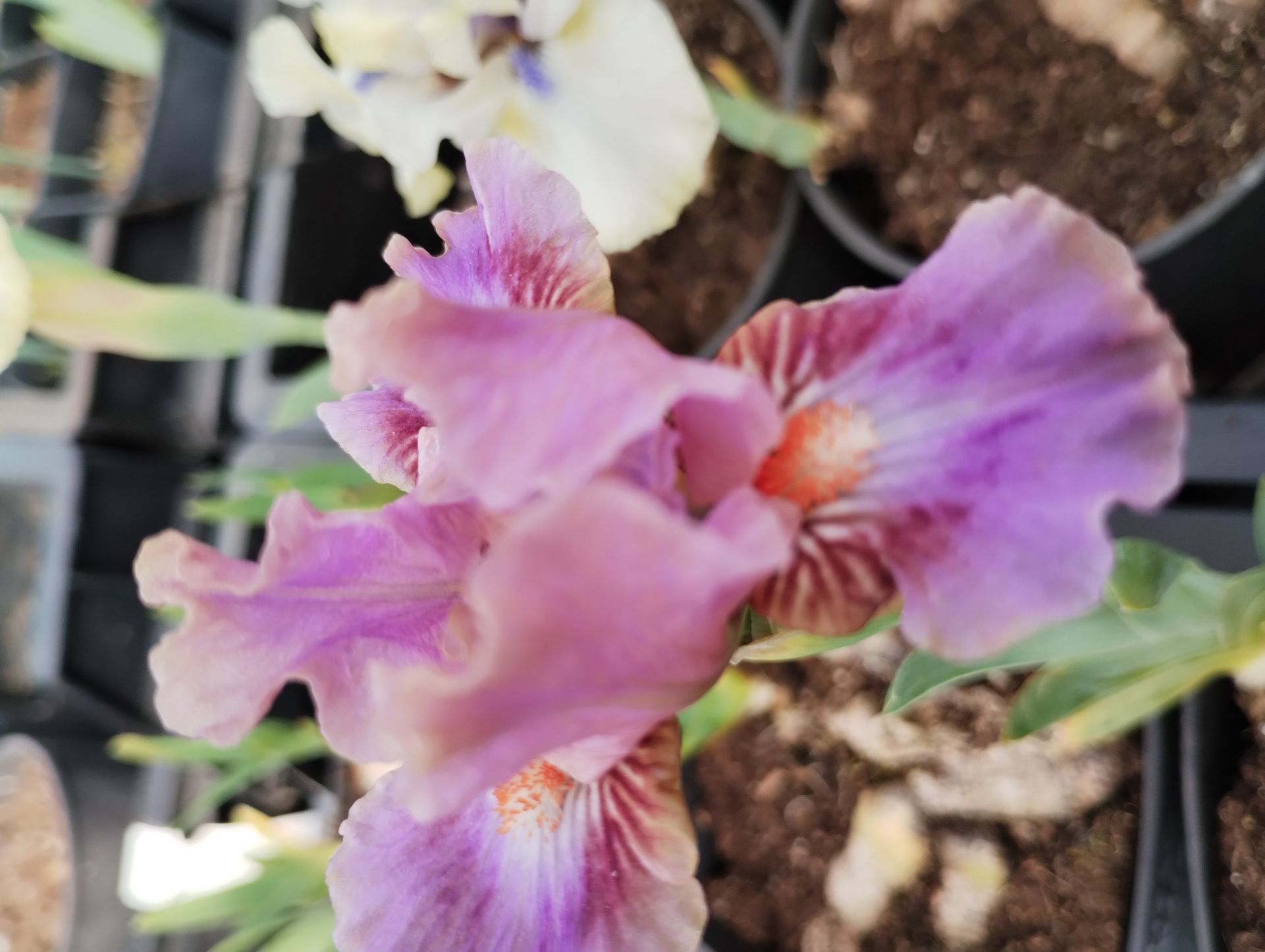 Gewasse lichtblauw witte standaards met geel paarse lip.